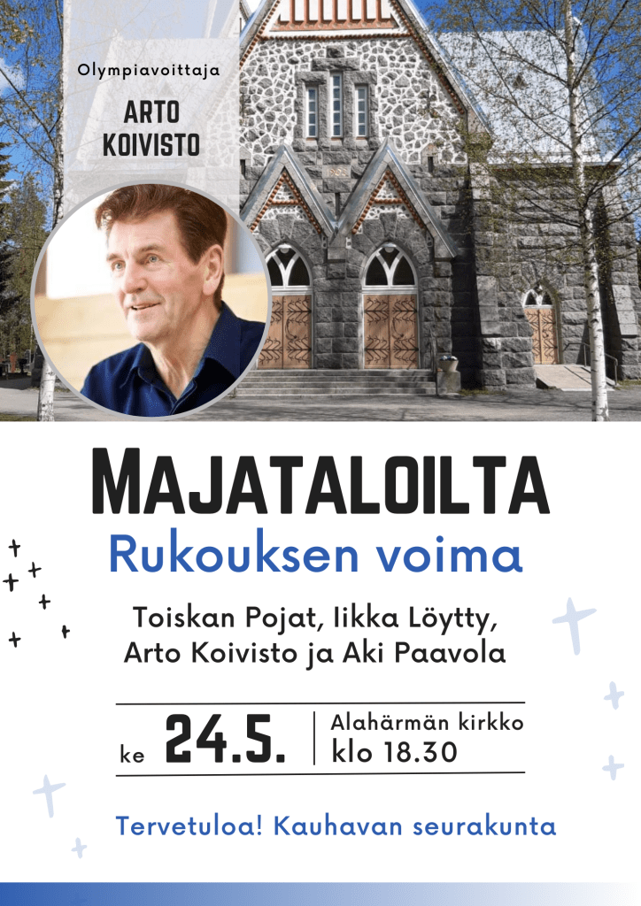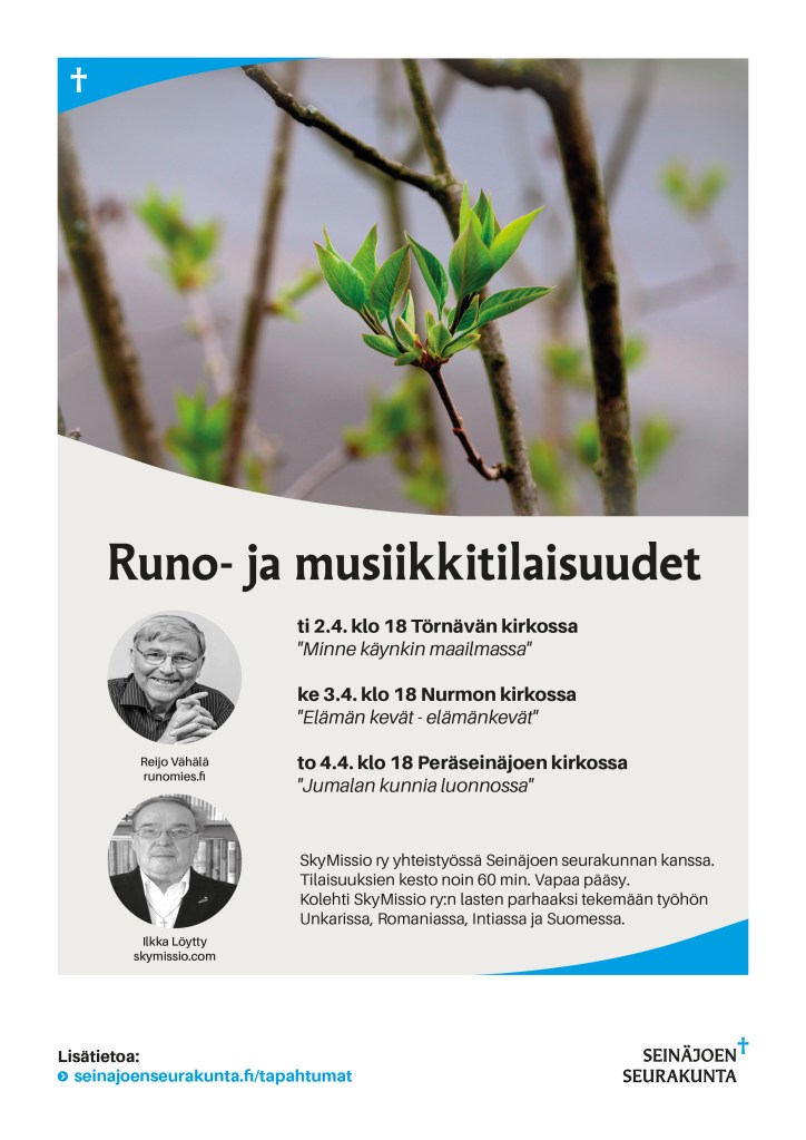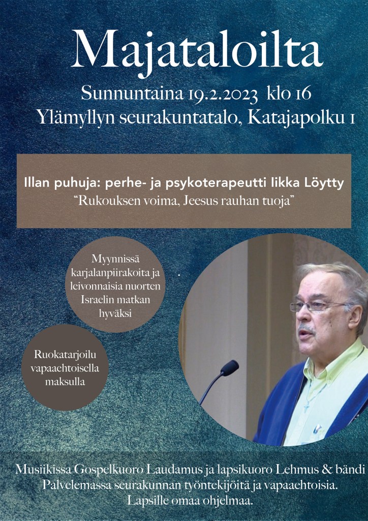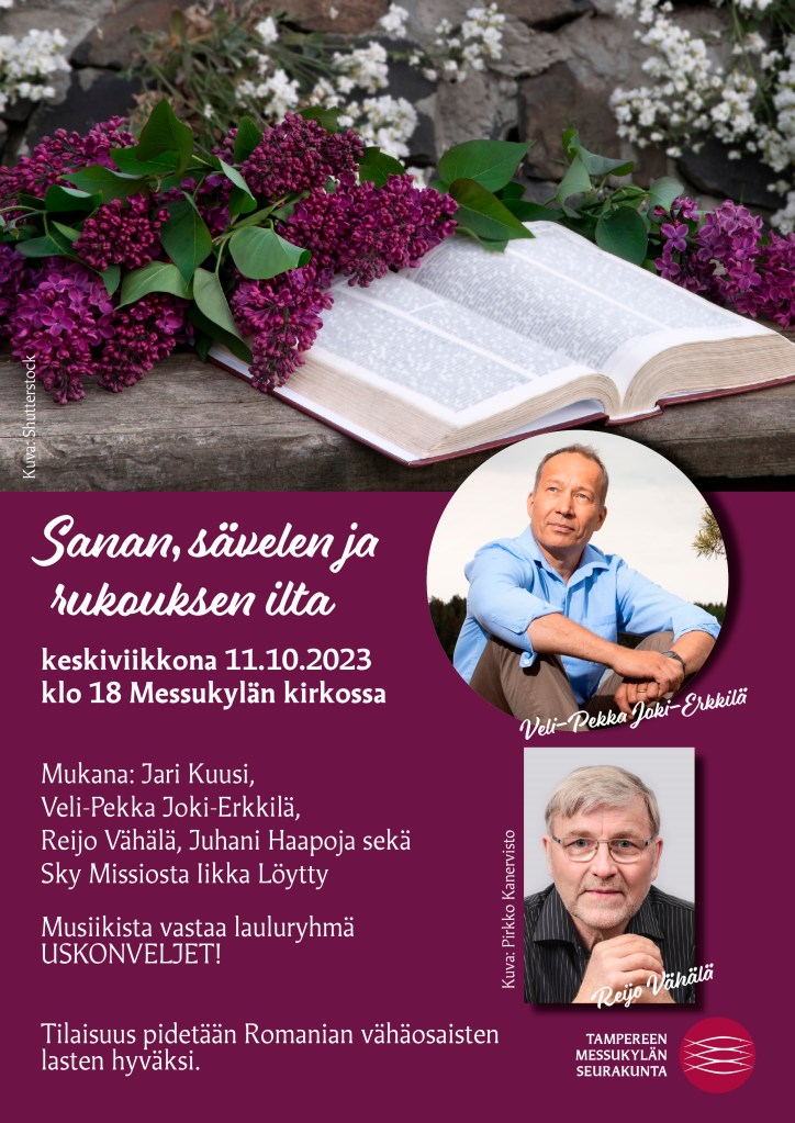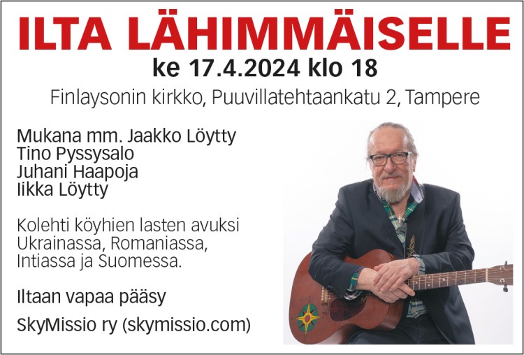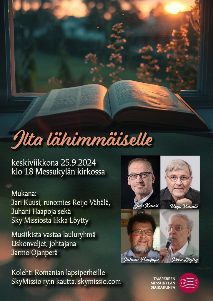 Ilta lähimmäiselle. Puhujavieraana Iikka Löytty SkyMissiosta ja ”runomies” Reijo Vähälä. Mukana lisäksi Juhani Haapoja Suomen Gideoneista.