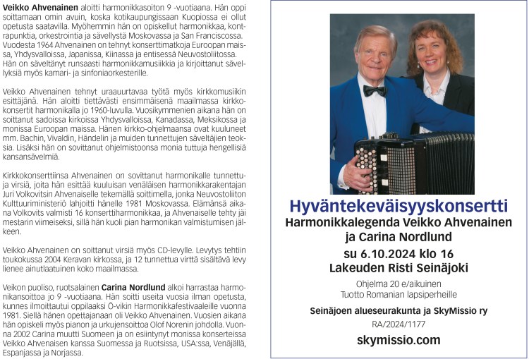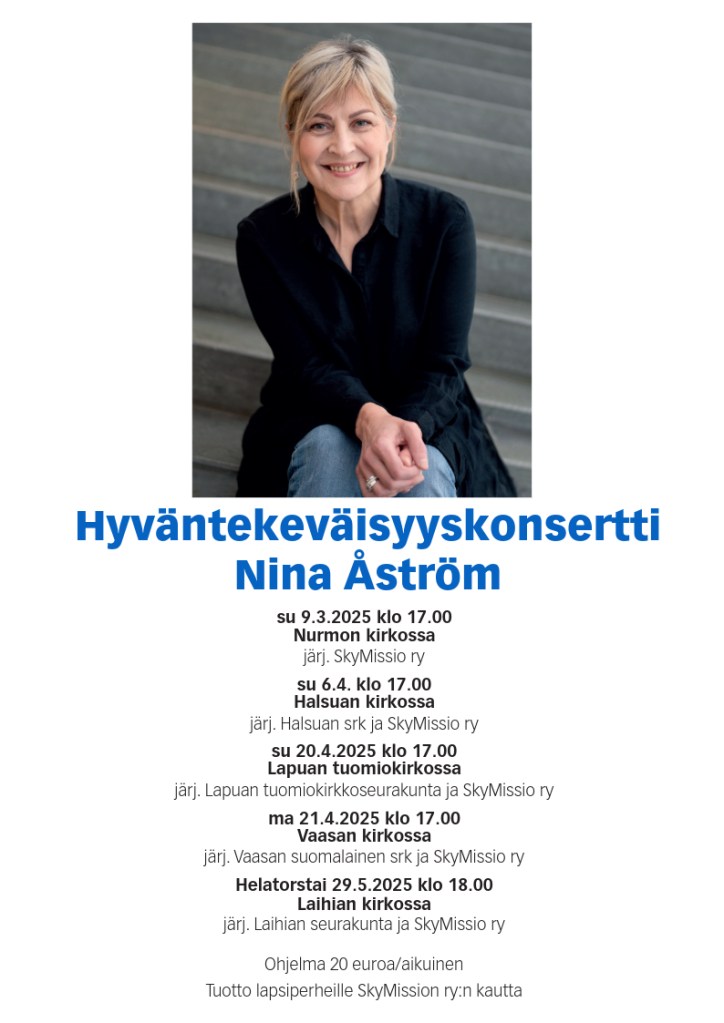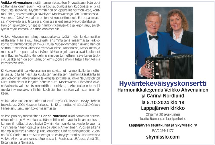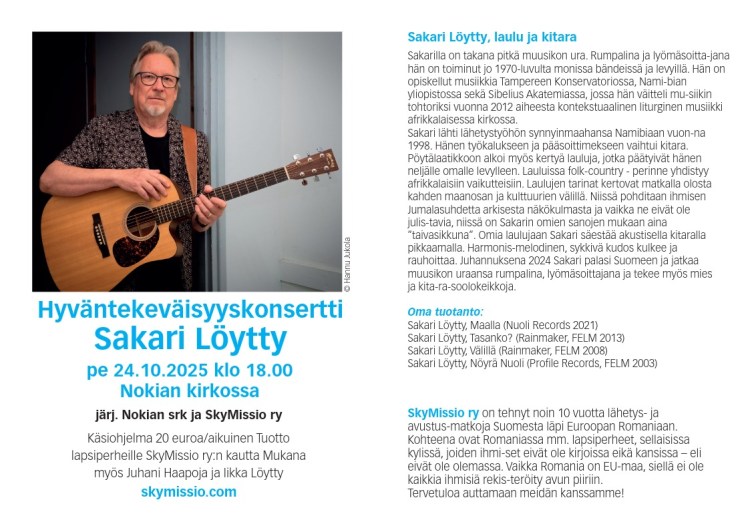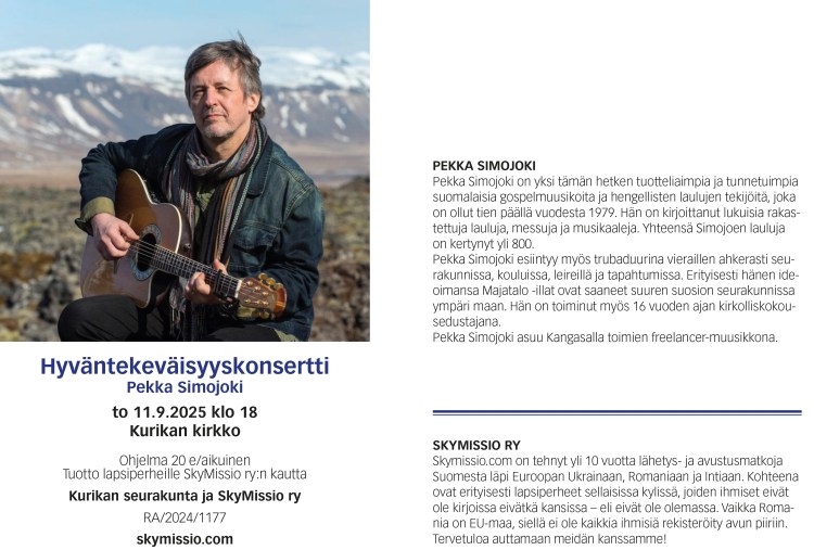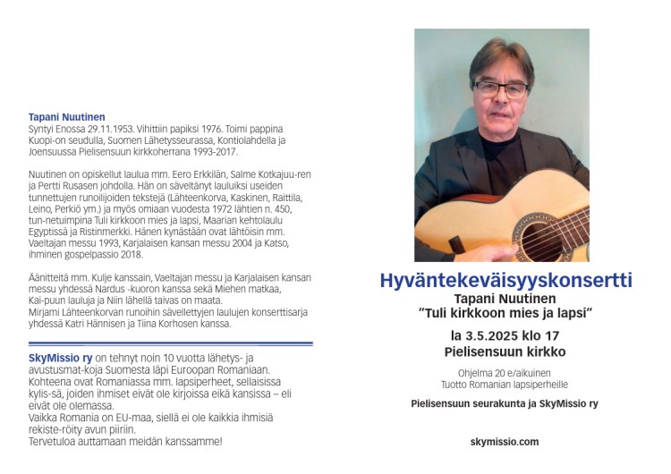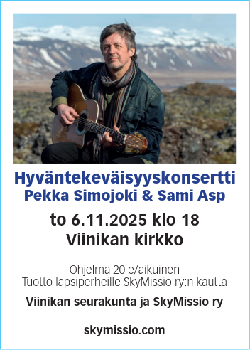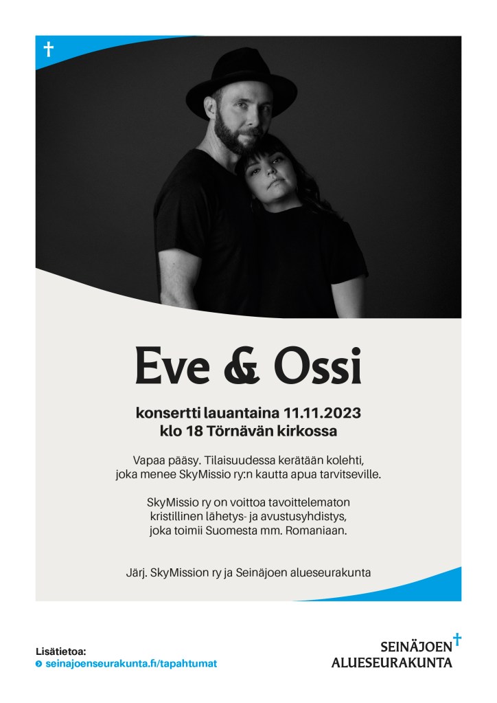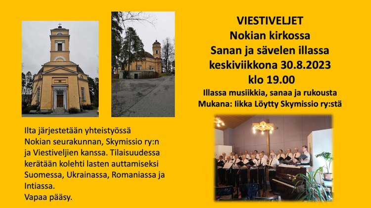 Musiikista vastaa yhteiskristillinen kuoro Viestiveljet, johtajanaan Jarmo Ojanperä. Mukana myös Iikka Löytty Skymissio ry:stä.Ilta järjestetään yhteistyössä Skymissio ry:n kanssa. Tilaisuudessa kerätään kolehti lasten auttamiseksi Suomessa, Ukrainassa, Romaniassa ja Intiassa. Vapaa pääsy. - Eve ja Ossi Nurmon kirkossa 8.9.2023 klo 18,